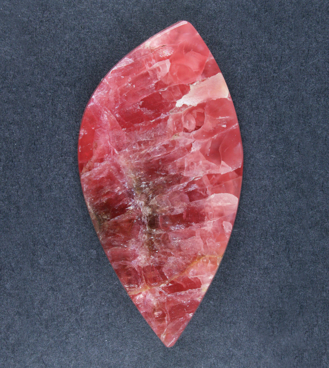 A Fantastic designer cabochon of super gemmy electric pink and white rhodochrosite. An extraordinary and well designed gem with unbelievably bright color and a unique design. It has a glossy high polish front and back and is professionally cut. Slightly beveled to facilitate setting, it will look beautiful set in one of your designs or as a terrific addition to your collection. This stone measures 54x27 mm and is 4 mm thick the weight is 78 cts. Don't let this one get away ! As always, Thanks for looking ! . |