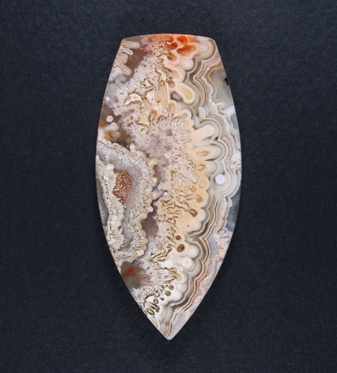 A gorgeous designer cabochon of dramatic Crazy Lace Agate. White with Orange and a lttle Red, and with a colorful assortment of tight banded formations, plumes and eyes. A really amazing stone! It has a glossy high polish front and back and is professionally cut. Slightly beveled to facilitate setting, it will look terrific set in one of your designs or as a terrific addition to your collection. This stone measures 58x28 mm and is 5 mm thick the weight is 71 cts. Don't let this one get away! As always, Thanks for looking! . |