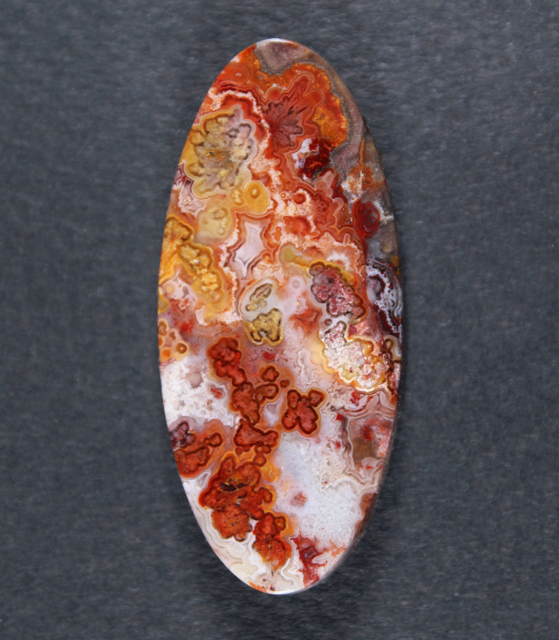A colorful cabochon of bright Crazy Lace Agate. Red, orange, and yellow with an interesting colorful assortment of tight banded formations, tubes and great bright colors. A really amazing stone! It has a glossy high polish front and back and is professionally cut. Slightly beveled to facilitate setting, it will look terrific set in one of your designs or as a terrific addition to your collection. This stone measures 50x22 mm and is 6 mm thick the weight is 68 cts. Don't let this one get away! As always, Thanks for looking! . |