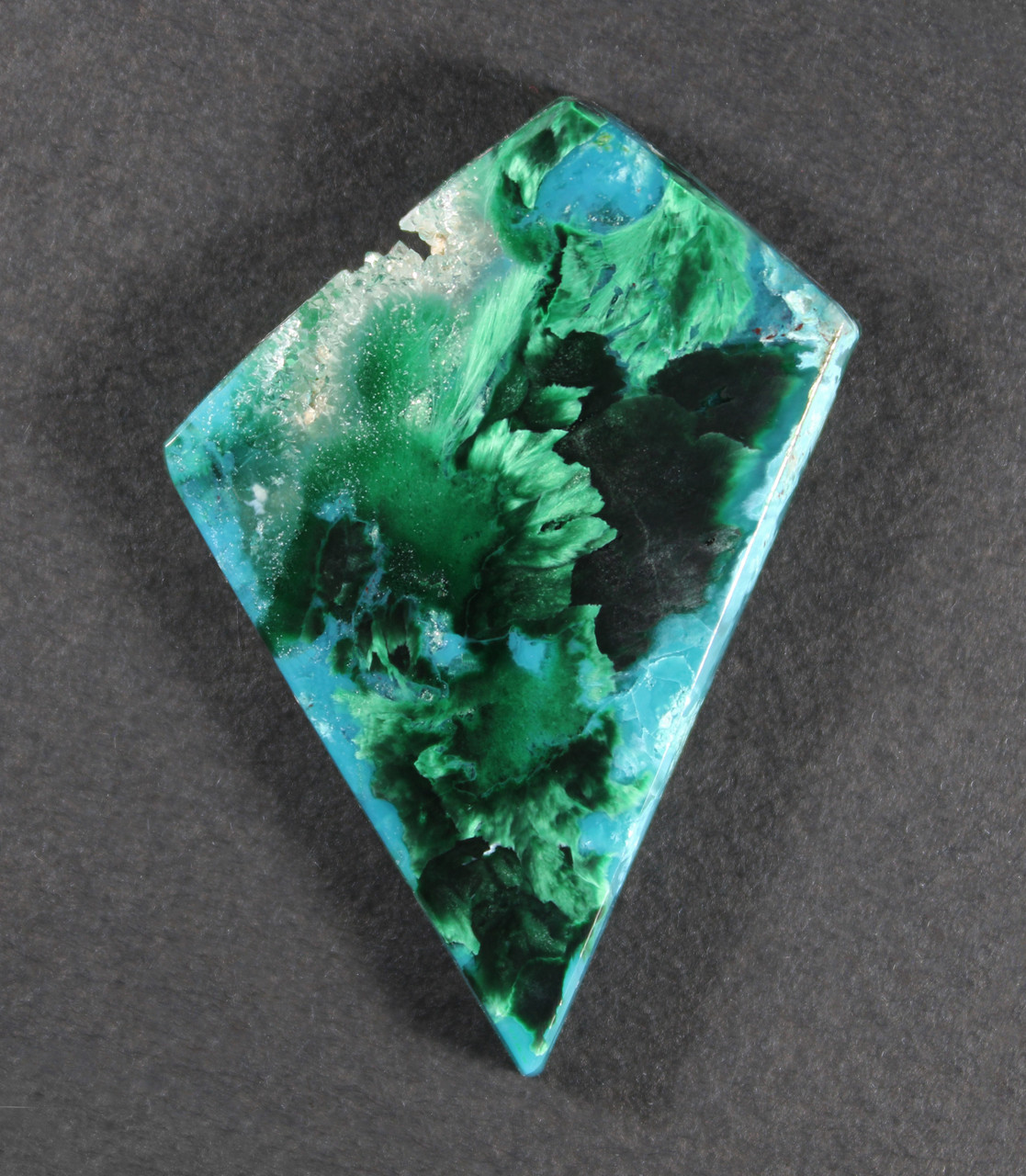 Exceptional! Gorgeous, deep blue gem Chrysocolla with chatoyant green Malachite sprays in chalcedony, deep aqua blue and chatoyant green in this dramatic designer cabochon. All natural material mined back in the 1950's in Arizona's Miami/Globe region. This stone has a high polish front and back and is professionally cut. Slightly beveled to facilitate setting, it will look great set in one of your designs or as a terrific addition to your collection. This stone measures 45x32 mm and is 5.5 mm thick, the weight is 60 cts. You will love this stone! As always, Thanks for looking! |