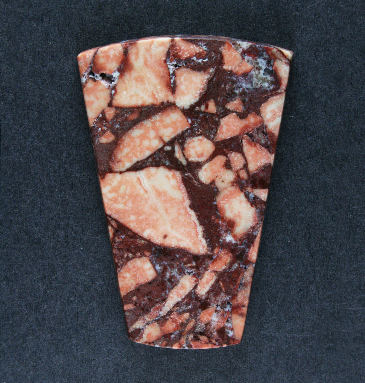 Dramatic pink brecciated patterns splashes against a deep red background with great colors and gorgeous patterns, an impressive stone with a great designer cut. A terrific example of this cool new jasper from Nevada. Wonderful intricate patterns in this a highly polished, beautifully cut stone. A classic! This stone is slightly beveled to facilitate setting, it will look beautiful set in one of your designs or as a great addition to your collection. This stone measures 41x28 mm is 5 mm thick and weighs 44 cts. A very attractive and colorful stone! As always, Thanks for looking!