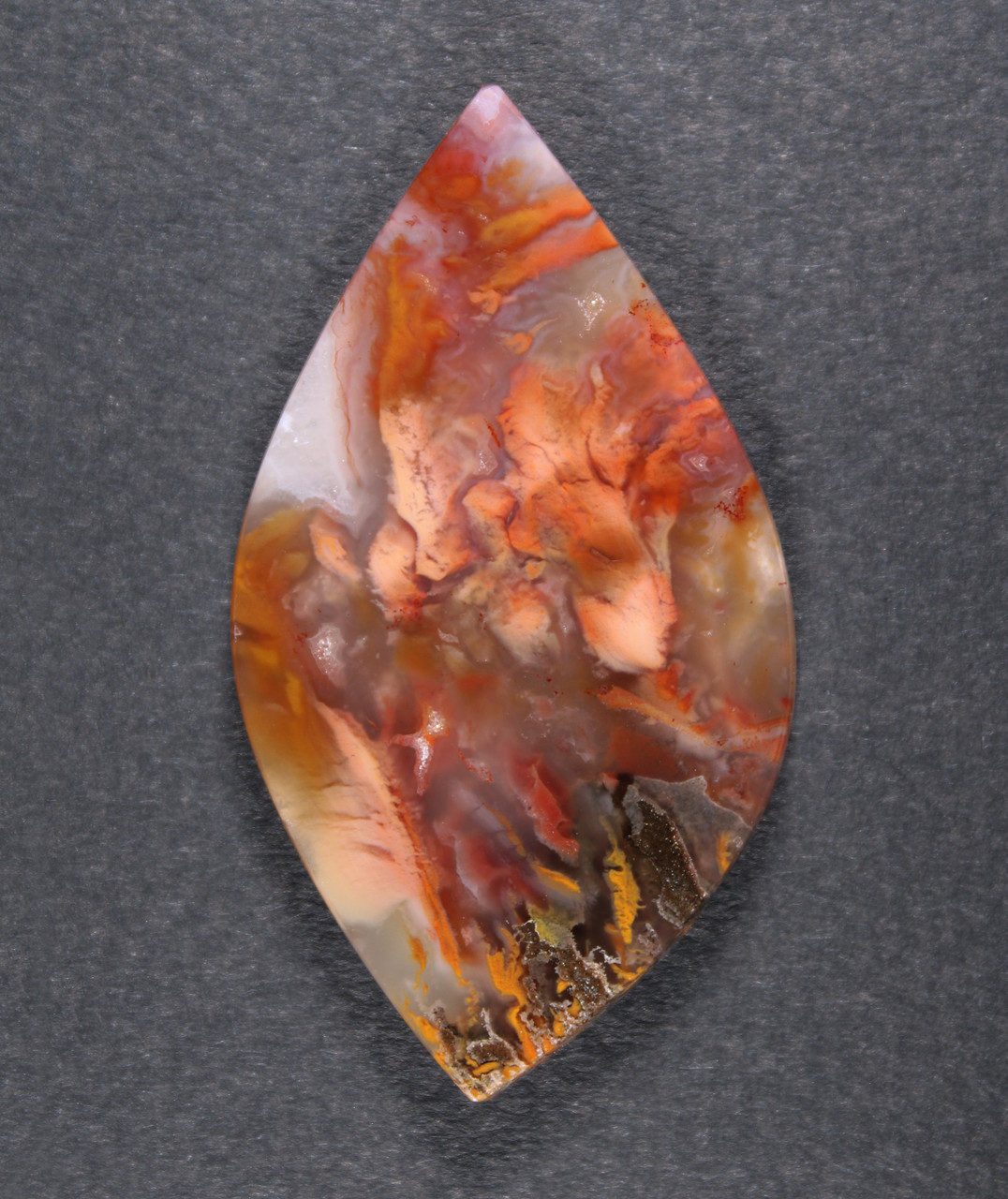 A beautiful designer cabochon of red, yellow and orange Bird of Paradise Plume Agate. A gorgeous stone with colorful feathery plumes in translucent chalcedony with tiny pockets of sparkling druzy. A really gorgeous and interesting stone of this rare material. This gemstone has a gorgeous high polish front and back and is professionally cut. Slightly beveled to facilitate setting, it will look beautiful set in one of your designs or as a terrific addition to your collection. This stone measures 56x31 mm and is 4 mm thick the weight is 61 cts. A really great gemstone for you! As always, Thanks for looking! . |