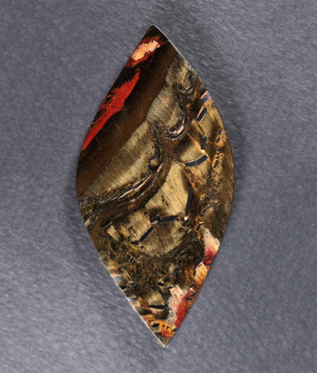 An exceptional chatoyant designer cabochon of green, yellow and red Australian Marra Mamba. Cool patterns and super flashy play of light ; Green with a little yellow and red and some dramatic Hematite bits. Alternating sections of shiny chatoyance and a black metallic hematite accents. Really beautiful! This gemstone has a glossy polish front and back and is professionally cut. Slightly beveled on the edges to facilitate setting, it will look great set in one of your designs or as a terrific additions to your collection. This stone measures 63x31 mm and is 6 mm thick, the weight is 110 cts. Don't let this one get away! As always, Thanks for looking! |