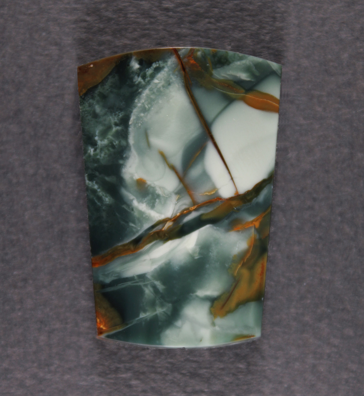Gorgeous Morrisonite Jasper! With beautiful dramatic patterns in various shades of light and dark green with orbs and a couple of streamers and some red/orange highlights. Totally amazing! A top shelf porcelain Jasper cut into a beautiful gemstone. This stone has a glossy high polish front and back and is professionally cut. Slightly beveled to facilitate setting, it will look beautiful set in one of your designs or as a terrific addition to your collection. This stone measures 38x26 mm and is 6.5 mm thick weight is 66 cts. Don't let this one get away! As always, Thanks for looking! . |