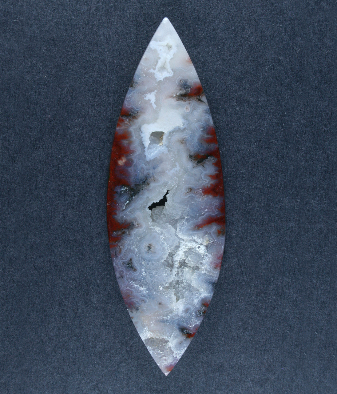 A Fantastic designer cabochon of red and white Bullion plume agate from California. Dramatic red plumes and white fortification patterns in translucent chalcedony around several pockets of druzy with exceptional details and patterns. A very rare and amazing stone! An extraordinary and well designed gem with fantastic colors and plumage. It has a glossy high polish front and back and is professionally cut. Slightly beveled to facilitate setting, it will look beautiful set in one of your designs or as a terrific addition to your collection. This stone measures 66x22 mm and is 5 mm thick the weight is 60 cts. Don't let this one get away! As always, Thanks for looking ! . |