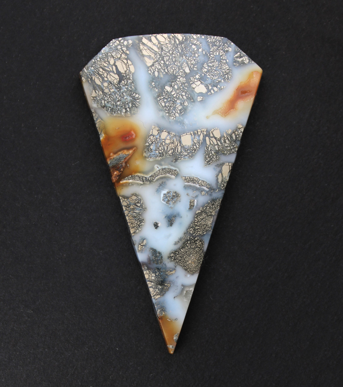 Beautiful and ornate! Dramatic gold metallic Marcasite brecciated patterns in orange and white semi translucent Chalcedony from Indonesia. This is a gorgeous recently found variety of Marcasite Agate, very unusual and cool. It is a very nice gem and a great example of this unique material. This stone has a glossy high polish front and back and is professionally cut. Slightly beveled to facilitate setting, it will look great set in one of your designs or as a terrific addition to your collection. This stone measures 62x35 mm and is 6 mm thick, the weight is 93 cts. Don't let this one get away! As always, Thanks for looking! Please visit me on Facebook as Gerard Scott Designs - Designer Cabochons sign up for " Stone of the Day " and receive a daily photo of a favorite cab from the archives. |