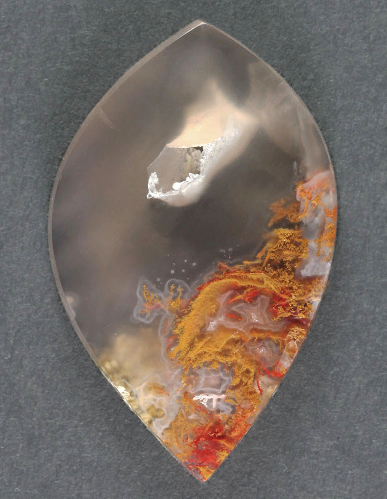 A Fantastic designer cabochon of red and yellow Utah moss agate. A very nice colorful moss from Utah. Beautiful intricate mossy inclusions in translucent chalcedony with lacy fortification patterns and a nice druzy pocket. An pretty and well designed gem with bright color. It has a glossy high polish front and back and is professionally cut. Slightly beveled to facilitate setting, it will look beautiful set in one of your designs or as a terrific addition to your collection. This stone measures 44x27 mm and is 6 mm thick the weight is 51 cts. Don't let this one get away! As always, Thanks for looking! . |