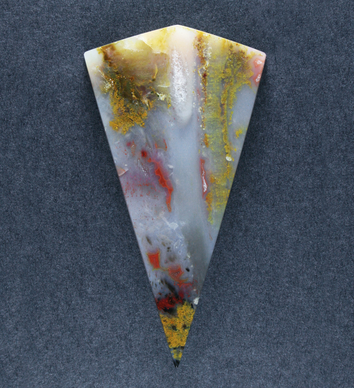 An incredible designer cabochon of multicolored Grassy Mountain Petrified Wood from Oregon. Gorgeous red, yellow and white sort of plumey patterns with little red fortifications. One nice piece of wood! A really interesting and beautiful gem. This stone has a glossy high polish front and back and a great professional cut. Slightly beveled to facilitate setting, it will look great set in one of your designs or as a terrific addition to your collection. This stone measures 58x32 mm and is 4.5 mm thick, the weight is 53 cts. As always, Thanks for looking! |
