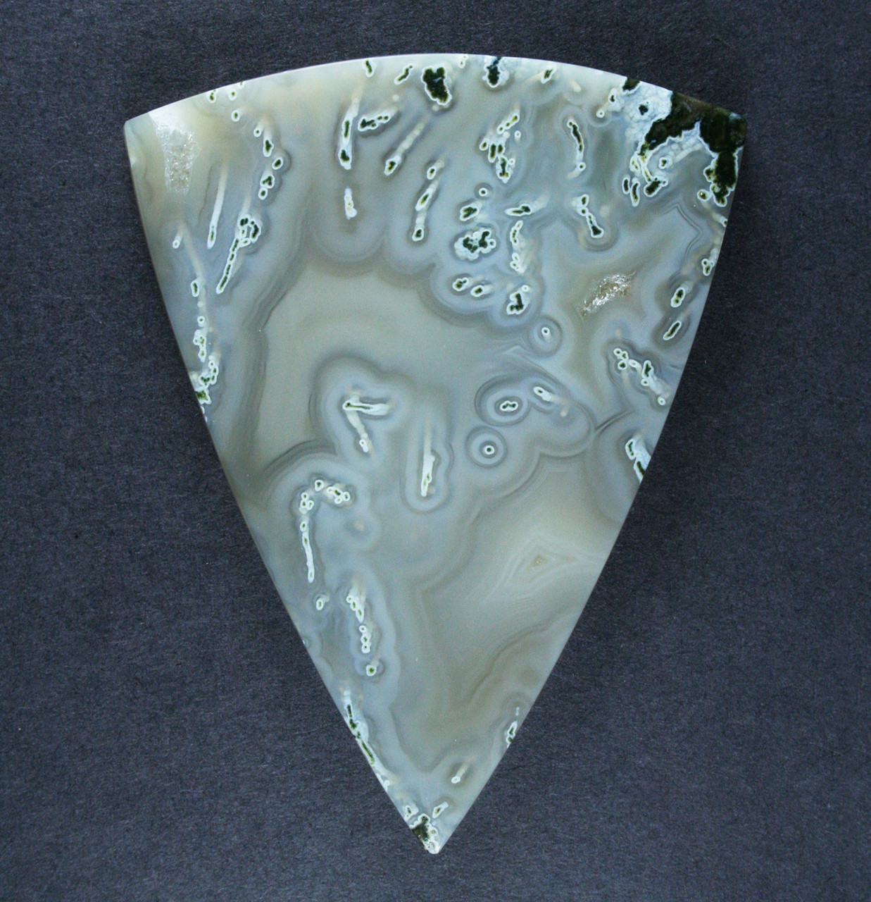 A big dramatic designer cabochon of top shelf Thunder egg agate from the Lucky Strike mine in Oregon. This one is unusual for a Lucky Strike with finely detailed white tubes surrounded by gorgeous fortification patterns in semi translucent chalcedony. An absolutely gorgeous gem and a very unusual example of this beautiful material. This stone has a glossy high polish front and back and has a great professional cut. Slightly beveled to facilitate setting, it will look terrific set in one of your designs or as a terrific addition to your collection. This stone measures 60x47 mm and is 7 mm thick, the weight is 132 cts. Don't let this one get awa! As always, Thanks for looking! |
