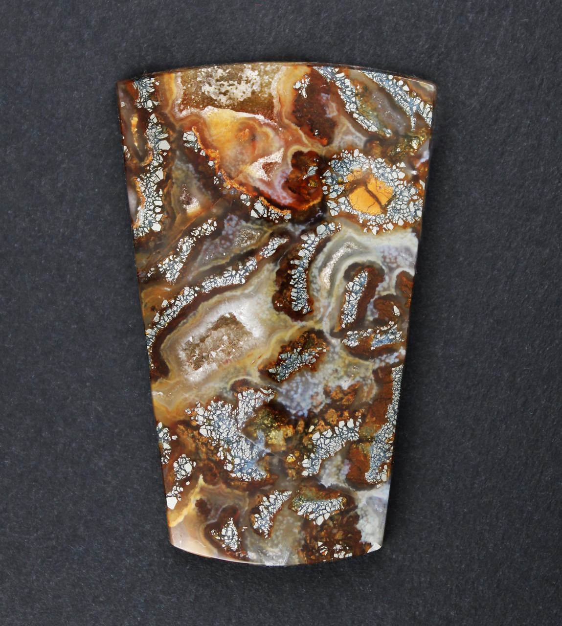 Beautiful and ornate! Dramatic gold metallic Marcasite eyes, flowers and brecciated patterns and some little druzy pockets in white, orange and yellow banded chalcedony from Indonesia. This is a gorgeous recently found variety of Marcasite Tube Agate, with the Marcasite replacing coral. It is a very nice gem and a great example of this unique material. This stone has a glossy high polish front and back and is professionally cut. Slightly beveled to facilitate setting, it will look great set in one of your designs or as a terrific addition to your collection. This stone measures 48x30 mm and is 5 mm thick, the weight is 76 cts. Don't let this one get away! As always, Thanks for looking! Please visit me on Facebook as Gerard Scott Designs - Designer Cabochons sign up for " Stone of the Day " and receive a daily photo of a favorite cab from the archives. |