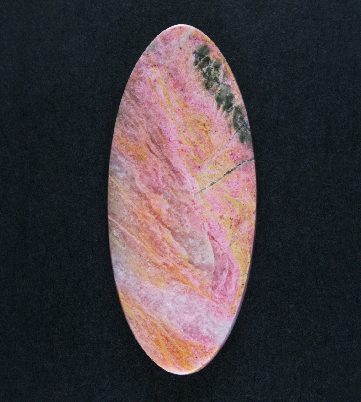 A Fantastic designer cabochon of pink, white and yellow Rhodonite from California. An extraordinary and well designed gem with beautiful bright color and a unique design. It has a glossy high polish front and back and is professionally cut. Slightly beveled to facilitate setting, it will look beautiful set in one of your designs or as a terrific addition to your collection. This stone measures 49x21 mm and is 5 mm thick the weight is 59 cts. Don't let this one get away! As always, Thanks for looking! . |