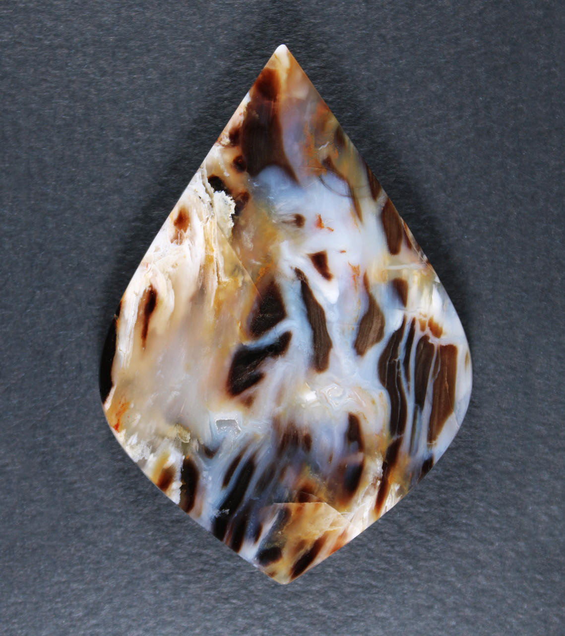 A wild designer cabochon of dramatic rare Shrinkwood from Texas. Dramatic patterns with black, white and tan in translucent Chalcedony, One nice piece of wood! A really rare and beautiful gem. This stone has a glossy high polish front and back and a great professional cut. Slightly beveled to facilitate setting, it will look great set in one of your designs or as a terrific addition to your collection. This stone measures 60x42 mm and is 5 mm thick, the weight is 103 cts. A rare and unique stone for you! As always, Thanks for looking! |
