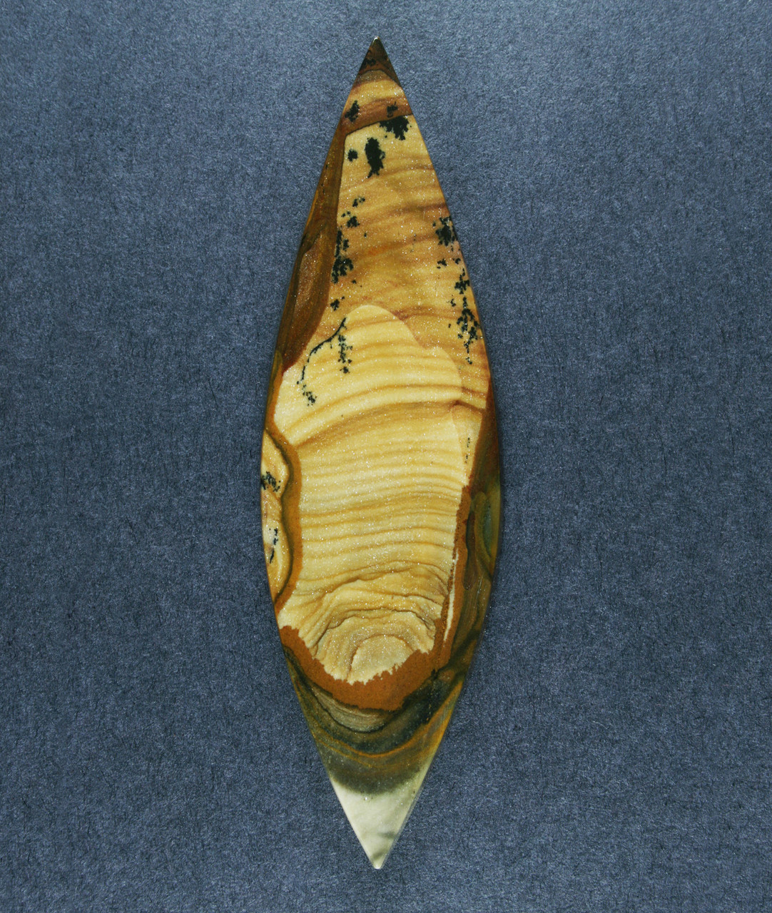 A handsome designer cabochon of Royal Sahara Picture Jasper picture jasper from North Africa. Beautiful waves and colors with unusual black dendritic patterns in this gorgeous material; a very dramatic gemstone! A well designed and beautifully cut gem of this interesting jasper from Africa. This stone has a beautiful polish front and back and is professionally cut. It is slightly beveled to facilitate setting and will look beautiful set in one of your designs or as a terrific addition to your collection. This stone measures 69x20 mm and is 4 mm thick, the weight is 48 cts. You will love this stone! As always, Thanks for looking! |